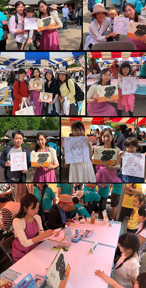 毎年、ドウビレンの似顔絵ブースを楽しみにしてくださっているお客様が多くいらっしゃるとの前情報通り、整理券は、順調になくなり、似顔絵を描いてもらったり、絵本作家と写真撮影をするなど、普段触れ合えない方々とのコミュニケーションが生まれ、どのお客様も大満足されておられるようだった。眺めている私自身もとても幸せな気持ちになれ、絵本が繋いだご縁のありがたさをかんじた。