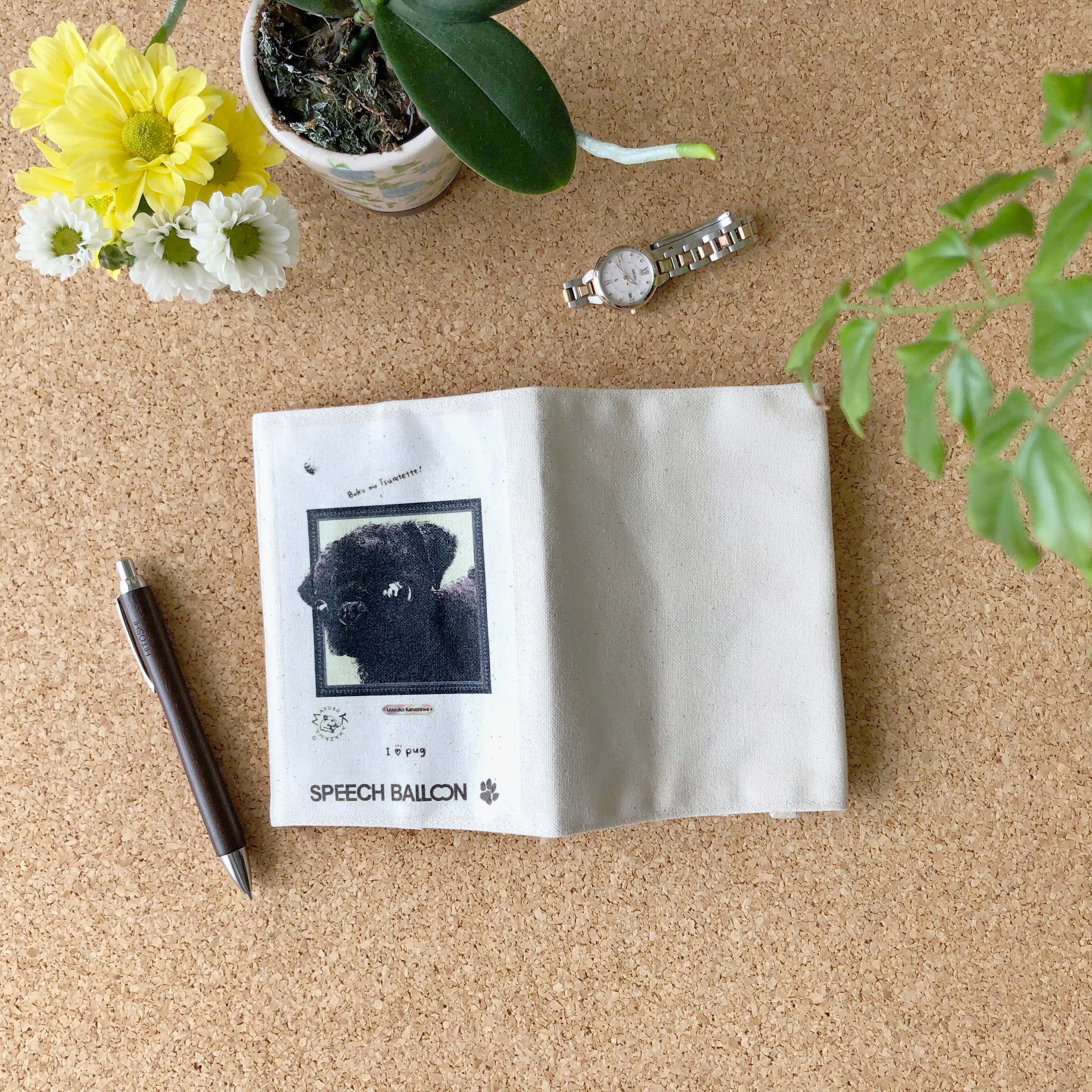 黒パグ「ブックカバー」品番:KMパグ「つれてって」絵本『ぼくぱぐ』文庫本カバー/A6手帳ケース