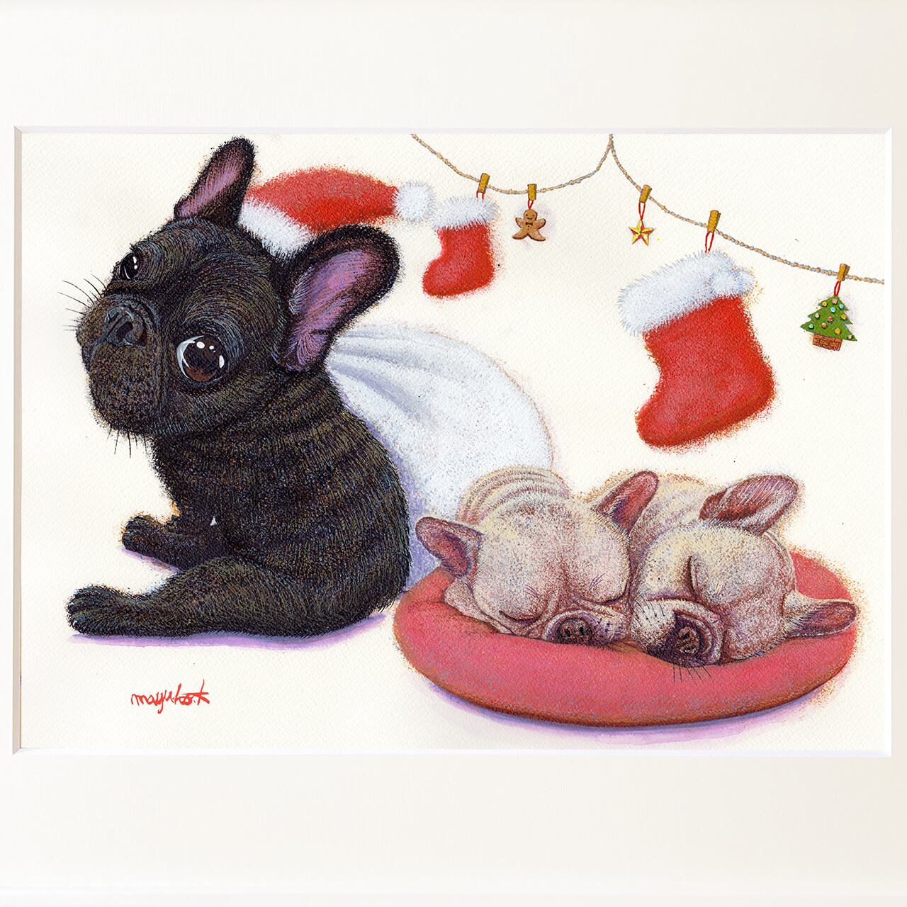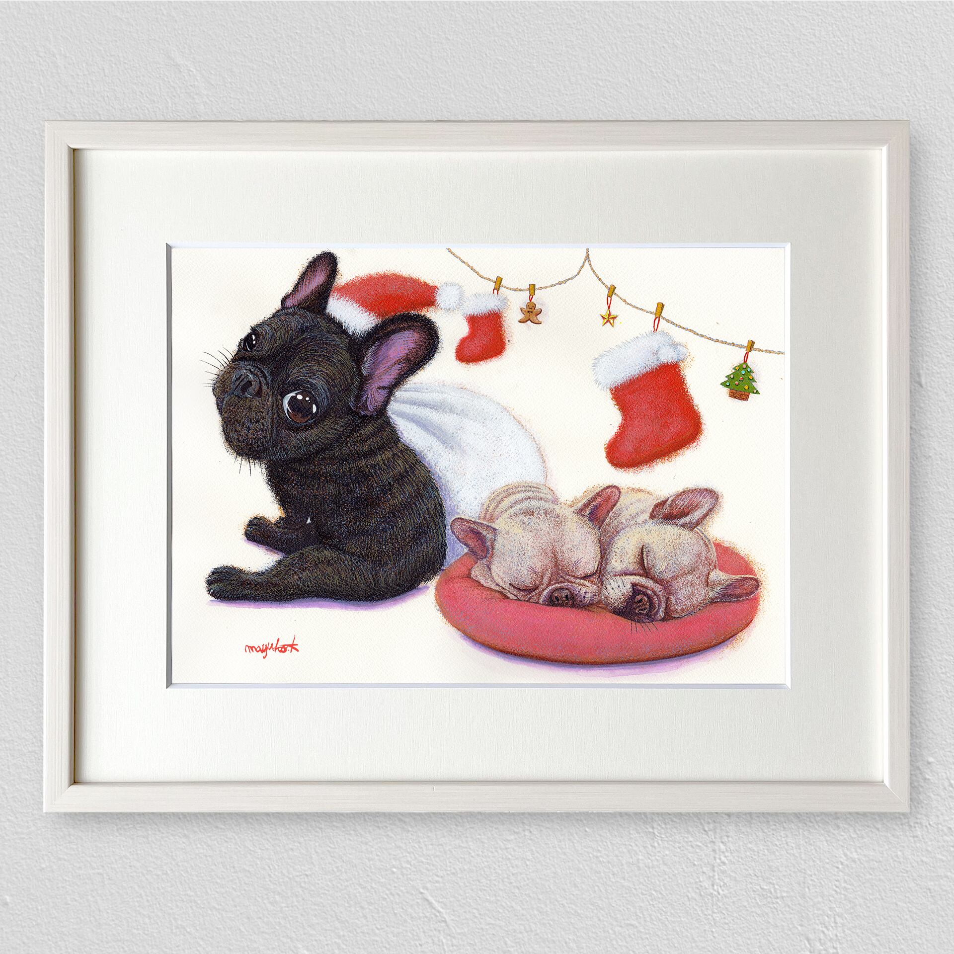 【フレンチブルドッグ】うちの子絵画『クリスマスの夜に』イラスト(額・マット付き)オリジナル原画/アクリル絵画 ※1点もの【送料無料】